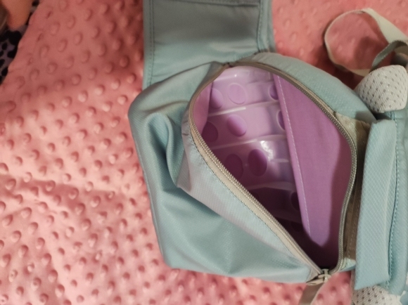 الميزانية الدفترية جيدة للأطفال الذين يمكن إبقاء رؤوسهم. لينة النسيج و البلاستيك إدراج ل صلابة. اللون هو أكثر خافت من على الإعلان. السوستة و carabiners طبيعية.
