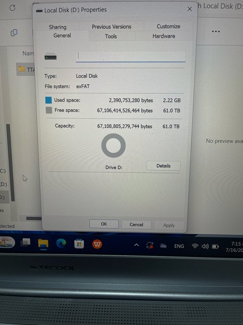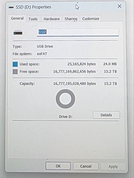 The lenovo engraved 16tb usb drive is all metal device and has a very nice locking mechanism preventing the drive from turning when trying to insert into the usb port. The drive is recognized as an ssd on my pc. The ssd is formatted as an exfat partition and shows 15.2tb when looking at the properties of the ssd drive. I was unable to format the ssd to ntfs. I am hoping that all of the 15.2tb will be available to me when i need it.
